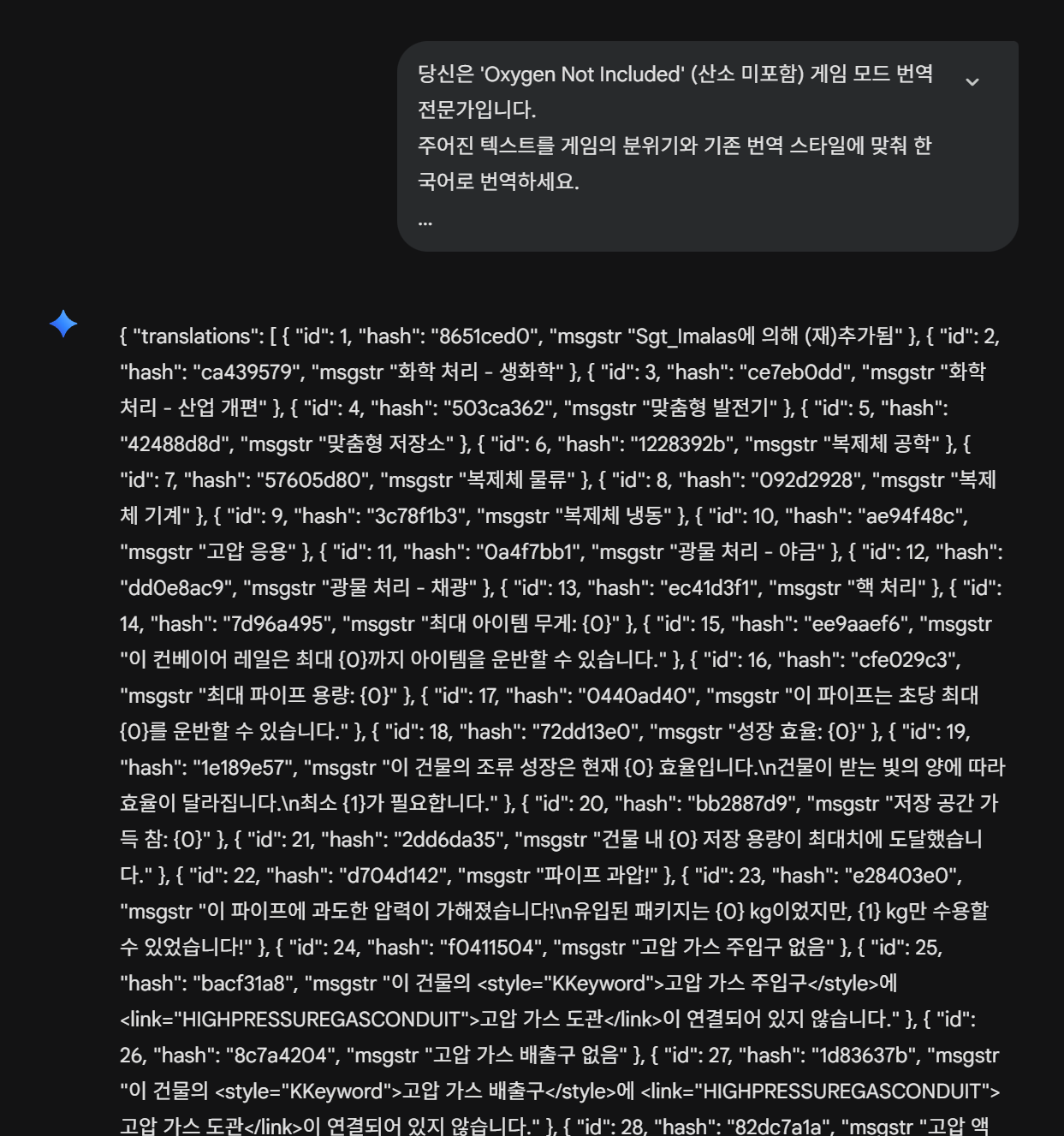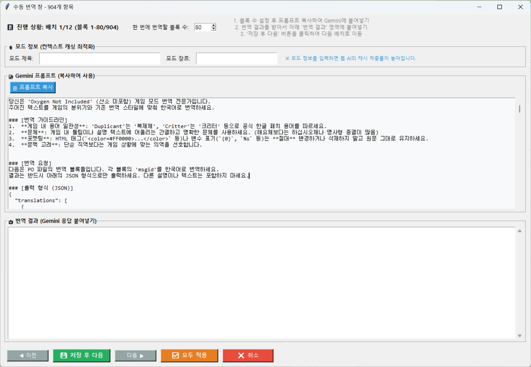 - 그러면 다음 배치가 진행되며 같은 방법으로 GEMINI 또는 AI 에게 번역을 시킨 뒤 결과를 붙여넣으면 됩니다.
